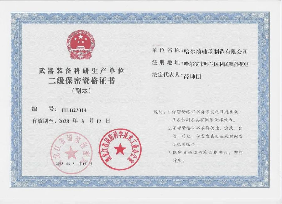 3月27日,建龍哈軸子公司哈爾濱軸承制造有限公司(簡稱哈軸制造)順利通過軍工二級保密資格單位審核,列入二級保密資格單位名錄,有效期為5年。