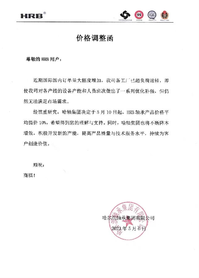 哈爾濱軸承集團(tuán)有限公司價(jià)格調(diào)整函